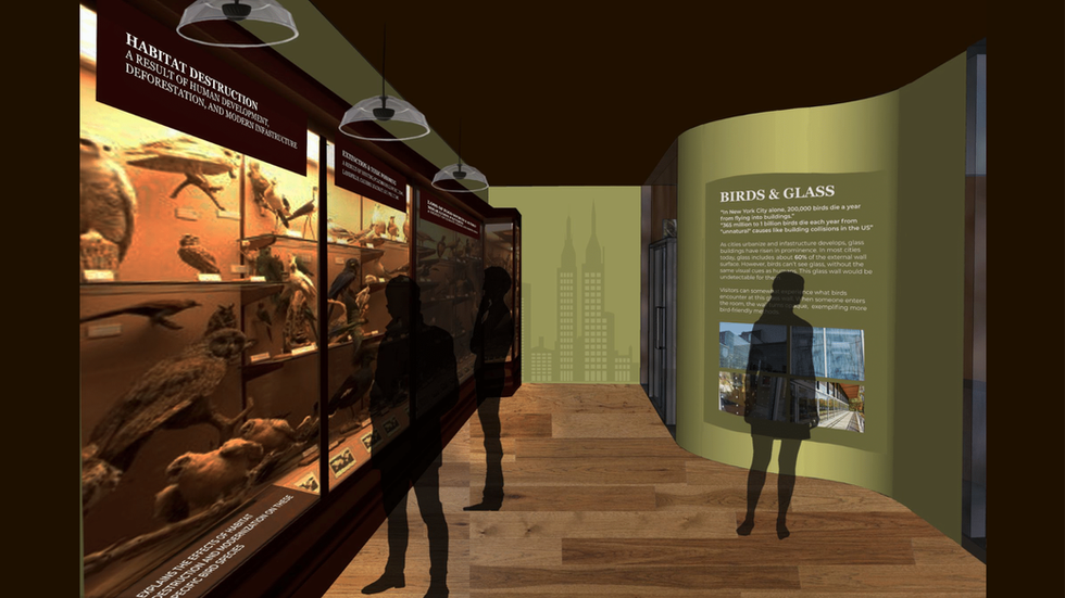 The top right image of a living room captures the clean, modern feeling I want the exhibit to embody, especially with see-through glass walls/ windows (similar to windows that birds typically run into) to exemplify how human construction has negatively affected the daily lives of birds. The top middle image is from the Carnegie Museum, where green is used as an accent color for their exhibit signage and text, and harsh lighting is used on their display cases. The main serif font is synonymous with the rustic feel of the dark brown wood grain, fitting the more serious and formal tone of the exhibit.I chose smooth dark brown wood patterns for the ground of the exhibit — laminate (fake wood) texture — to ironically play on how deforestation harms birds, and humans excessively use these materials. Being inside the exhibit will force people to face this issue head-on.
